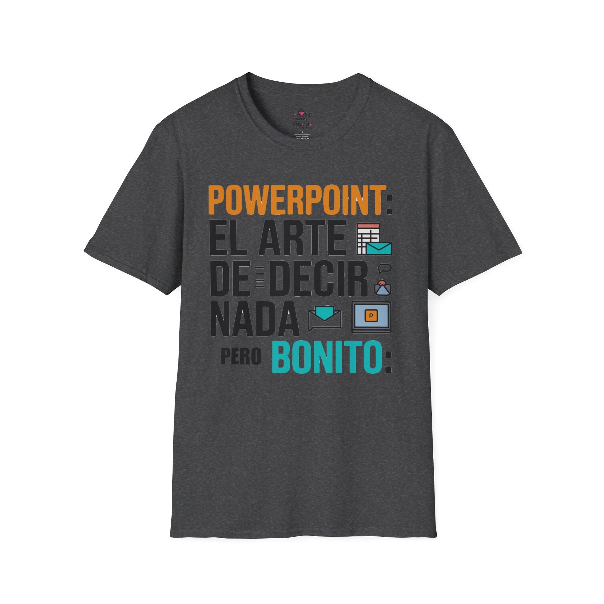 Esta camiseta con la frase "Powerpoint: el arte de decir nada pero bonito" está diseñada para quienes sobreviven al mundo laboral con sarcasmo, café y una ligera disociación estratégica.